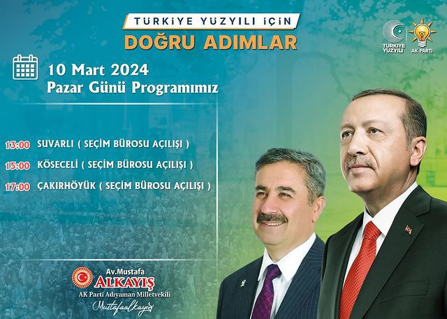 AK Parti Adıyaman Milletvekili Mustafa Alkayış, Suvarlı, Köseceli ve Çakırhöyük beldelerinde yeni seçim büro açılışları için halka bir davette bulundu.